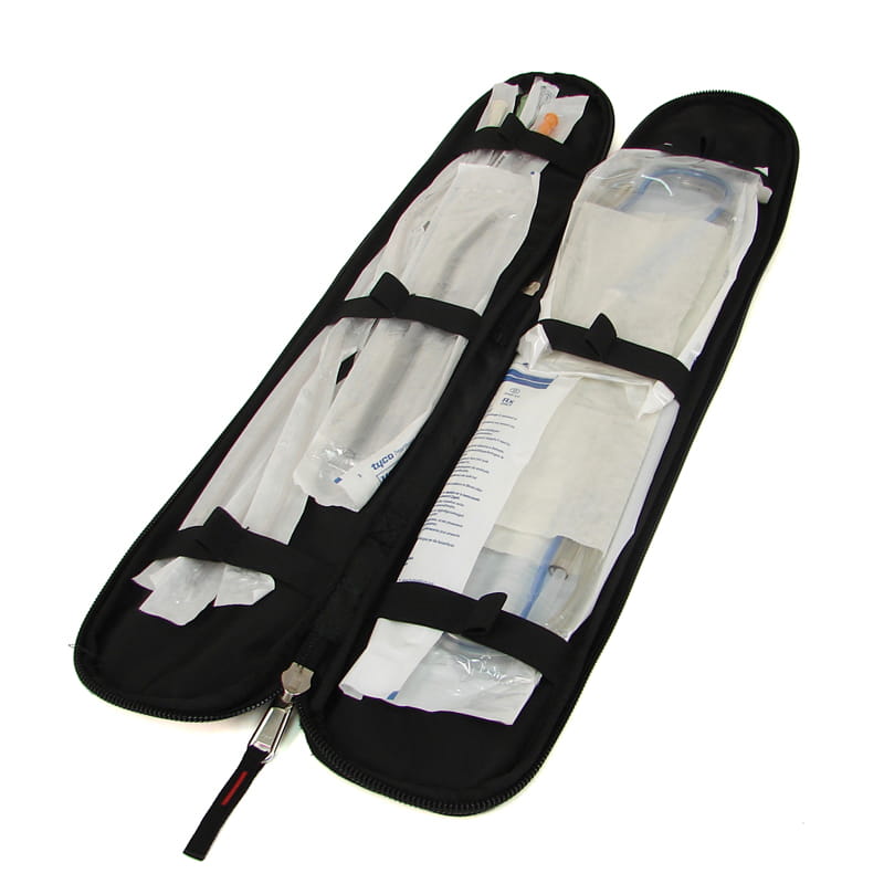 Trwałe etui wykonane z odpornego poliamidu, zaprojektowane do bezpiecznego transportu cewników. Wyposażone w elastyczne uchwyty, odblaskowe elementy i formowany uchwyt do wygodnego przenoszenia.