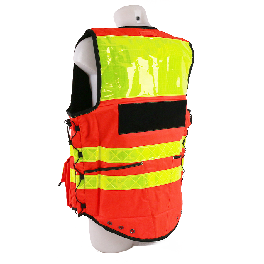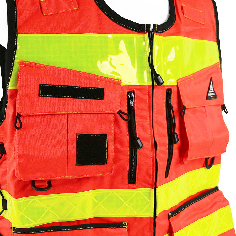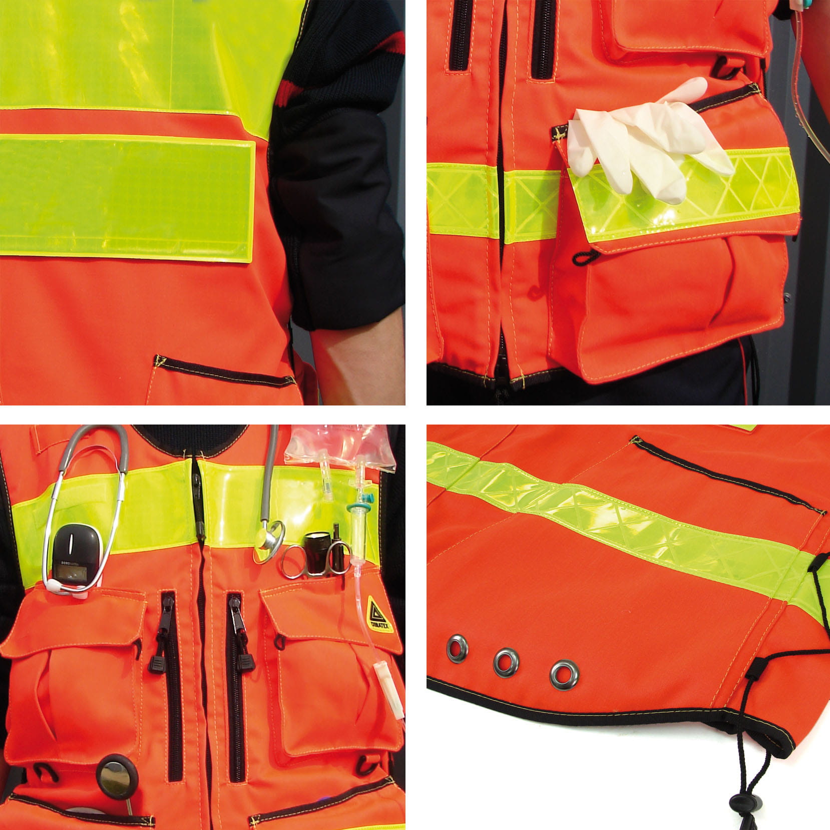 Wysokiej jakości kamizelka o podwyższonej widoczności, zgodna z normą EN 20471. Posiada wiele funkcjonalnych kieszeni, mocowania do sprzętu medycznego oraz opcję personalizacji.